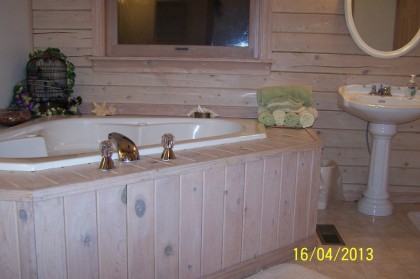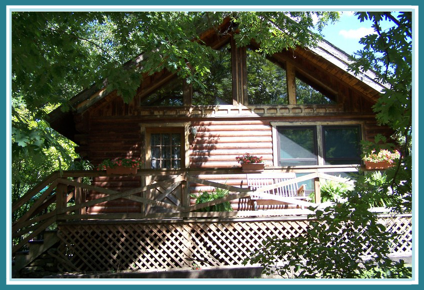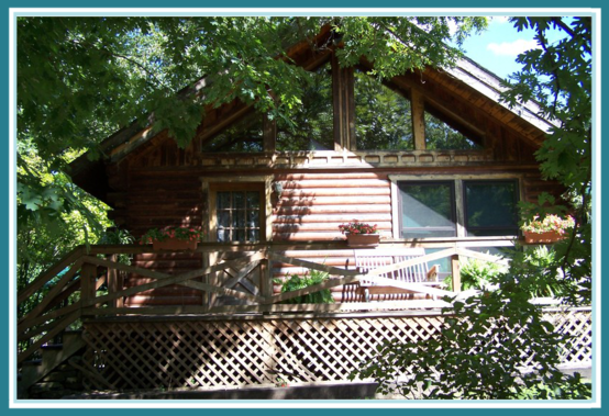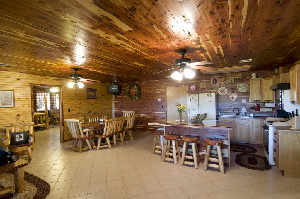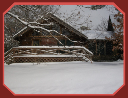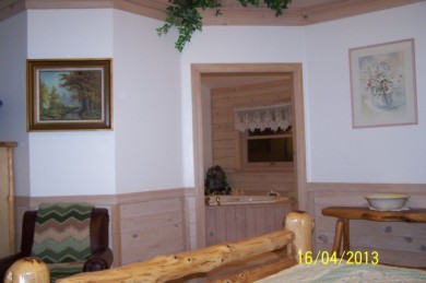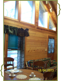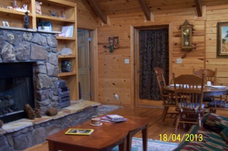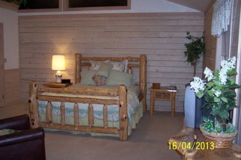 Our Luxury Suite offers a covered front porch with a double rocker. When you walk into the great room it has knotty pine floors and 20 foot ceilings. To the left there is a kitchenette and a half bath, To the right there is a natural stone gas burning fireplace, futon, antique oak dining table, and a full entertainment center. The large master bedroom is furnished with cedar log furniture plus a separate bathroom with a three person Jacuzzi and a double shower. The SUITE is attached to the main cabin and is separated by a sunroom with lock out doors so it offers the privacy of a log cabin and the luxury of a 5 star hotel.